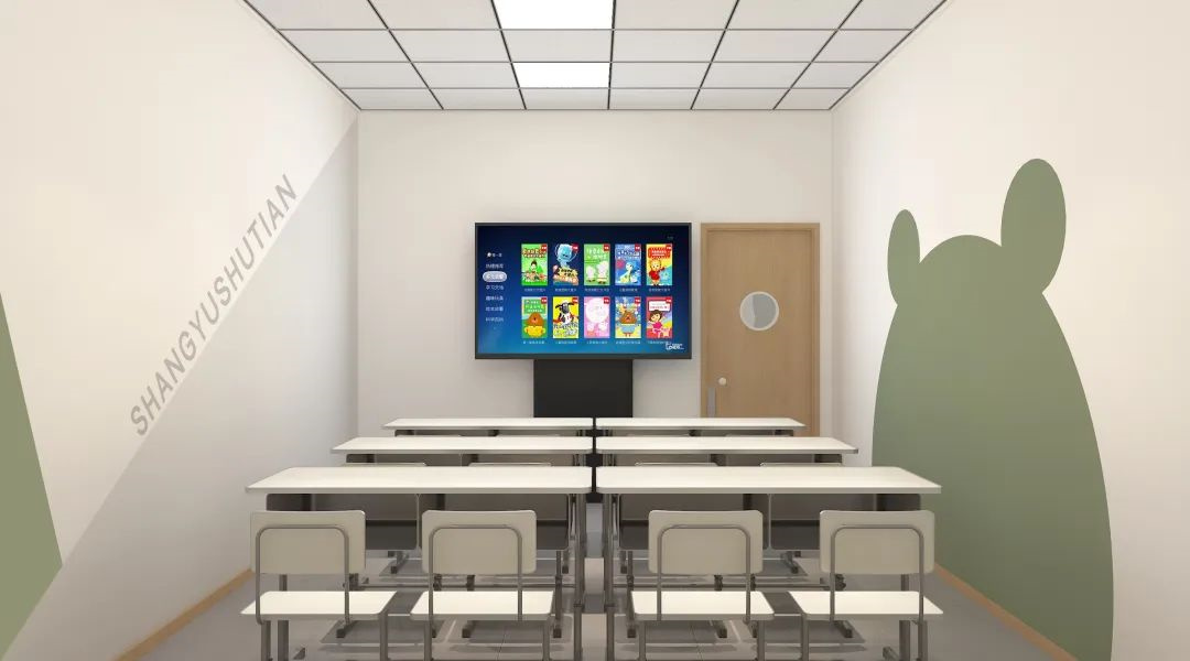 专业的阅读室内,空间则以简约为主,用黄色、白色、绿色及天然木质材料来搭建,更显温暖也更加专业,让孩子能在书本的世界里尽情遨游。
